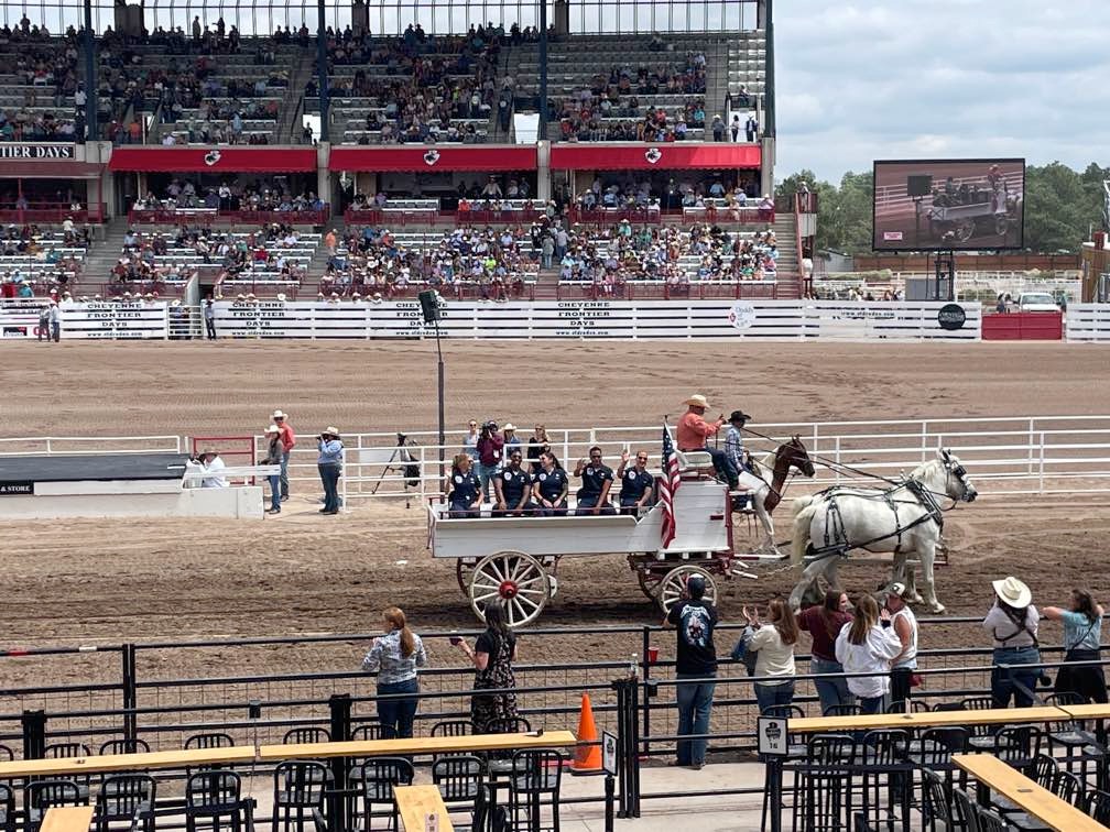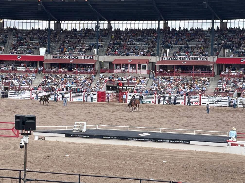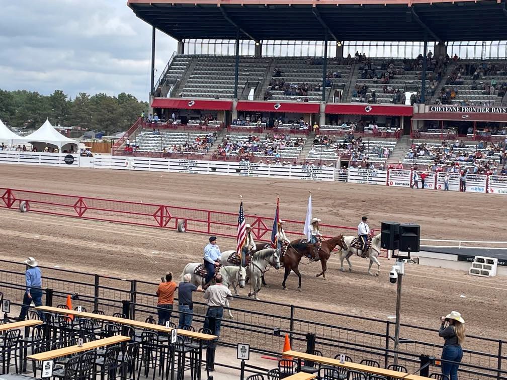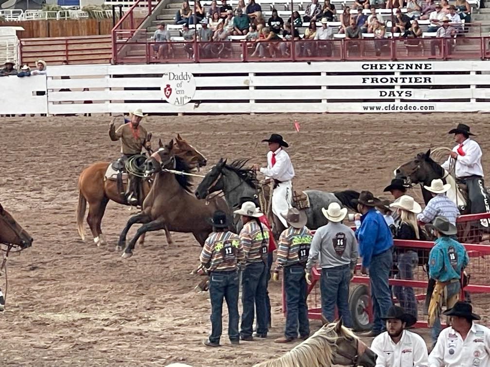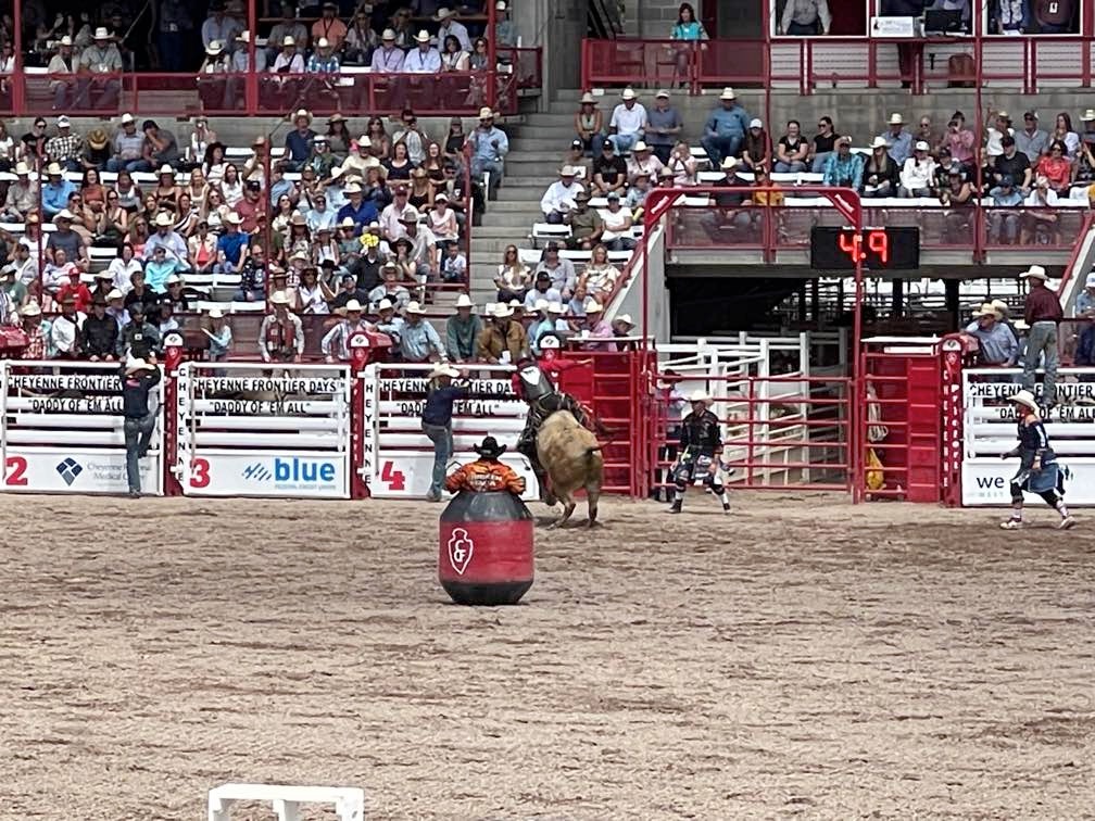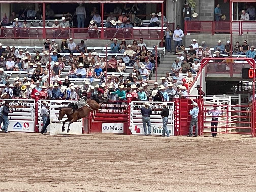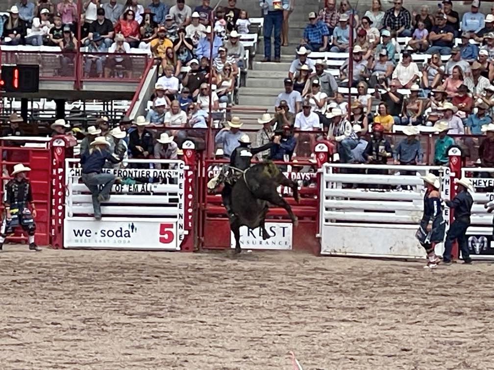 Two years in a row now we have made it to Cheyenne Frontier Days… The Daddy of ‘Em All. (Rodeos, that is.) Last year, I was laid up in a wheel chair due to an unfortunate altercation with gravity and a motorcycle. This year, I was slightly more mobile. We stayed at Terry’s Bison Ranch RV Park for the second time and Melinda rode their train that tours the massive acreage and one of the largest bison herds in Wyoming. We rode the bikes to see the Thunderbirds fly, as well as one of the parades downtown. Melinda attended Cowboy Church in the arena. (She might have been going just to see the cowboys. Not sure.)